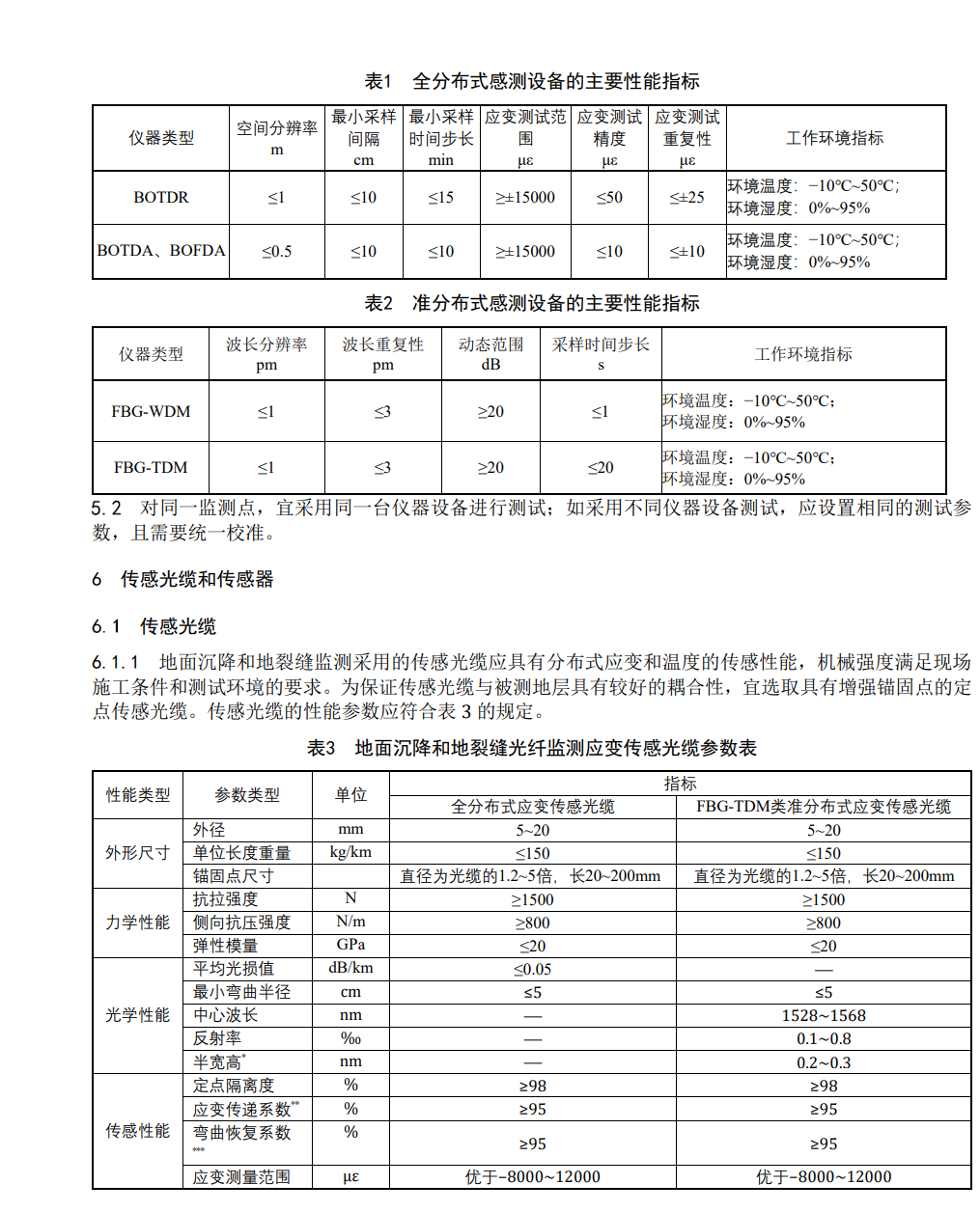 引 言 监测是地面沉降和地裂缝灾害防治的前提。采用分布式光纤感测技术监测地面沉降和地裂缝灾害具备 可行性和技术优势,可对地面形变、地层变形和地裂缝等进行分布式或准分布式监测。 多年实践表明,分布式光纤感测技术在地面沉降和地裂缝监测中成效显著,能够获得高空间分辨率监 测结果,可以成为一种常规的地面沉降和地裂缝监测手段。目前,我国没有地面沉降和地裂缝光纤监测相 关的技术规程。为了规范光纤感测技术在地面沉降和地裂缝监测领域的应用,支撑地面沉降和地裂缝灾害 防治决策,特制定本文件。